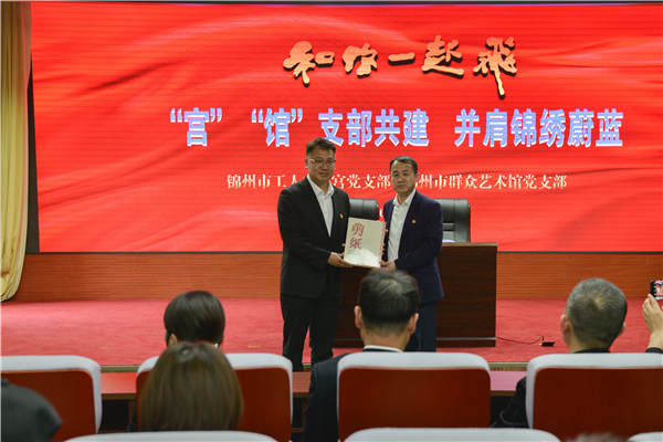 群眾藝術(shù)館黨支部書記敬彪代表支部贈送文化宮黨支部的共建禮物(中國非遺剪紙——醫(yī)巫閭山卷)